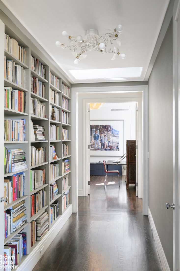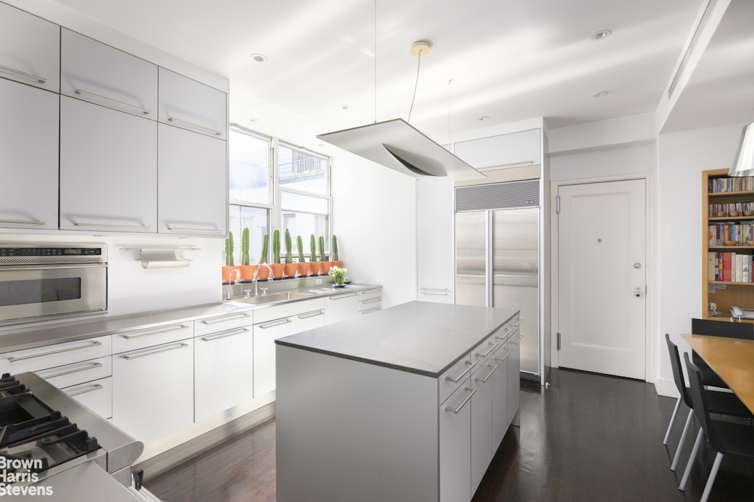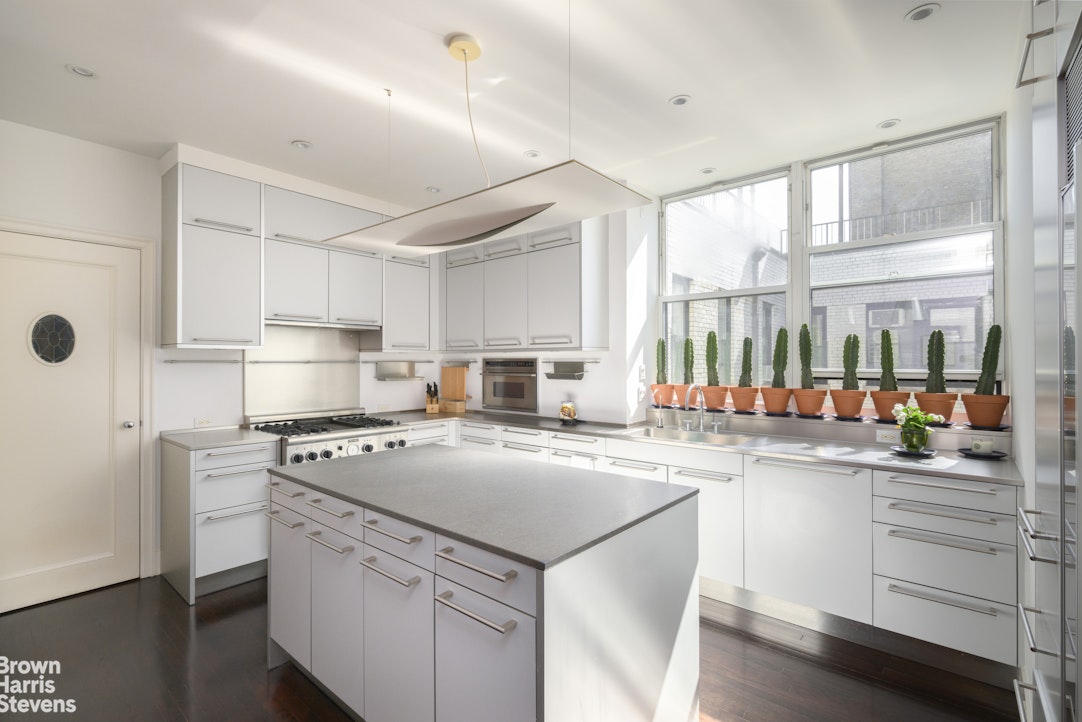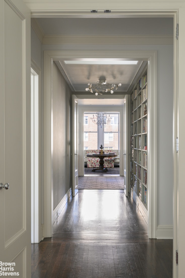 A large gallery with custom bookcases and skylight leads to the oversized chef's kitchen, featuring high-end stainless-steel appliances, custom Bulthaup cabinetry, a separate pantry, a large center island, and a separate breakfast dining area with built-in banquette. The primary suite is a true retreat (originally 2 rooms) with a wall of windows plus sitting area, two full, renovated bathrooms on opposite sides of the room, a custom dressing area, and two walk-in closets. Three additional large bedrooms, two with ensuite baths and enormous closets, plus an additional playroom/home office and hall bath complete the home. There is a separate laundry room with ample storage. Centrally air conditioned throughout. The apartment transfers with two storage bins.