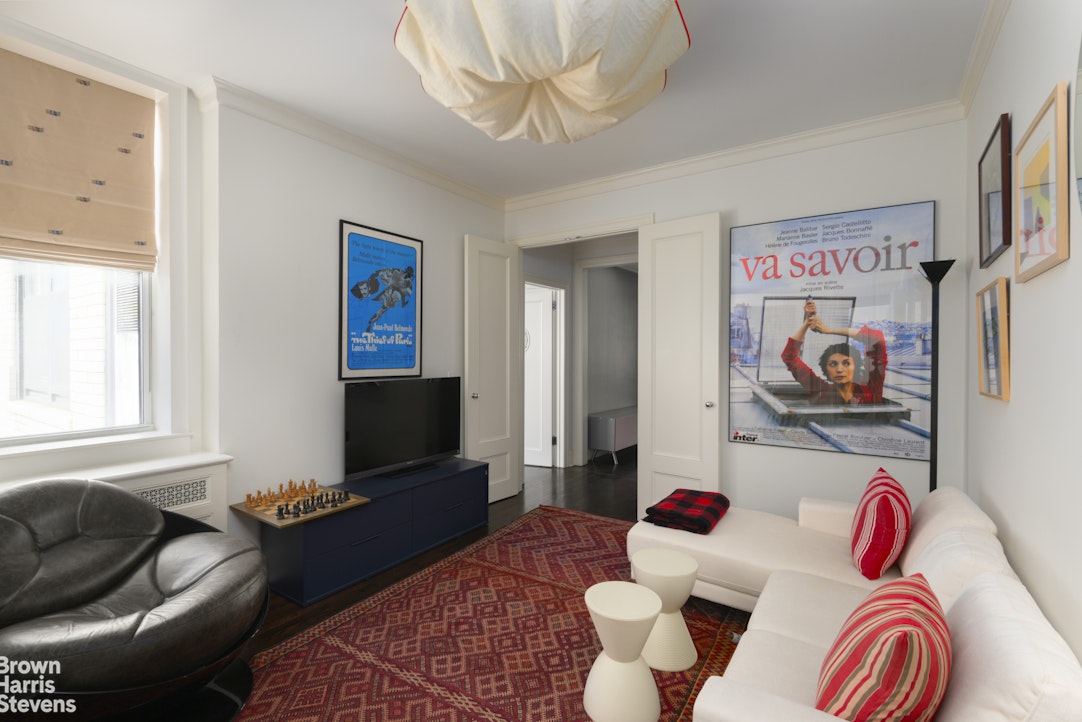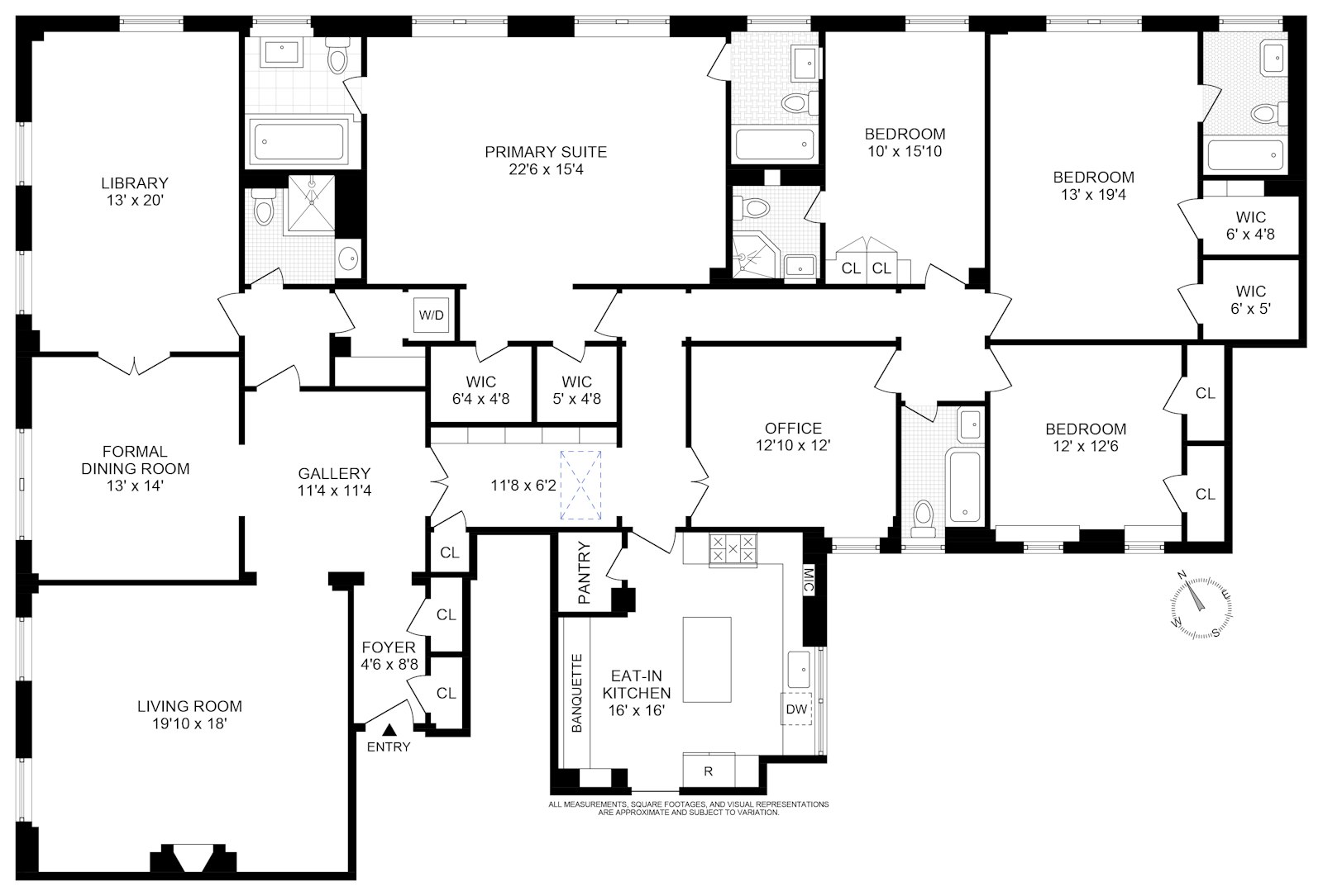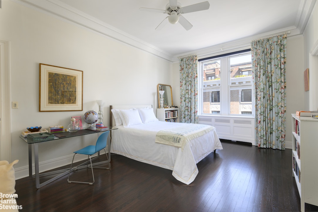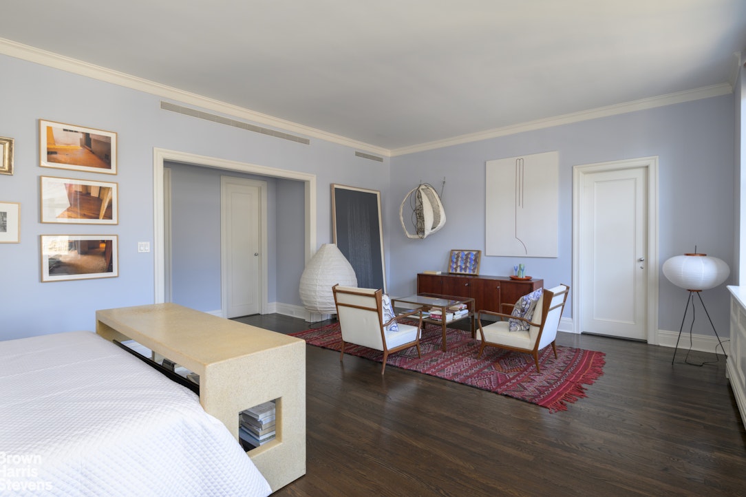 A large gallery with custom bookcases and skylight leads to the oversized chef's kitchen, featuring high-end stainless-steel appliances, custom Bulthaup cabinetry, a separate pantry, a large center island, and a separate breakfast dining area with built-in banquette. The primary suite is a true retreat (originally 2 rooms) with a wall of windows plus sitting area, two full, renovated bathrooms on opposite sides of the room, a custom dressing area, and two walk-in closets. Three additional large bedrooms, two with ensuite baths and enormous closets, plus an additional playroom/home office and hall bath complete the home. There is a separate laundry room with ample storage. Centrally air conditioned throughout. The apartment transfers with two storage bins.
