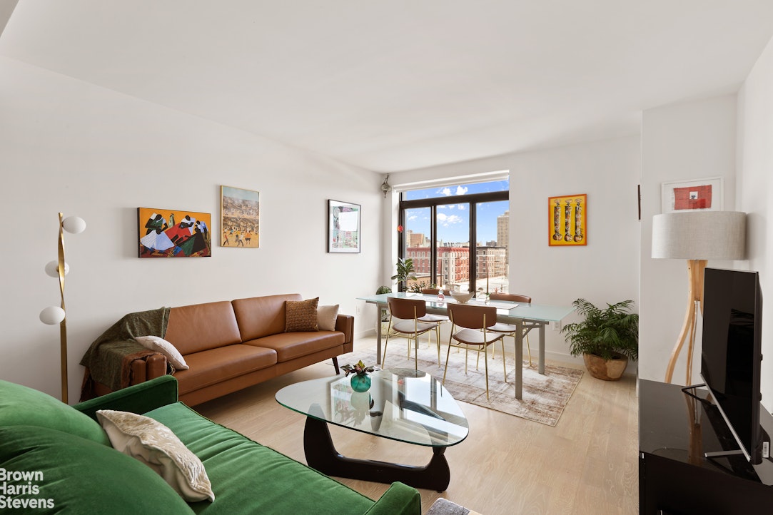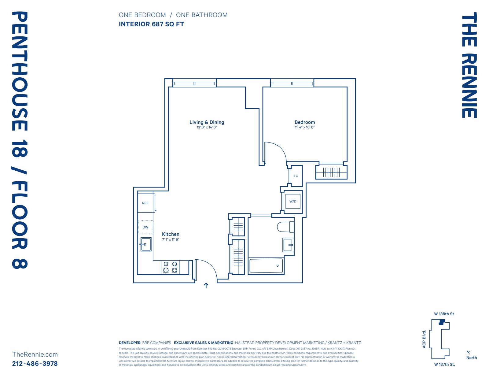 thermostat with remote access, Fisher & Paykel washer and dryer, USB charging ports, and pre-wiring for cable, telephone, and data. Central heating/ cooling and high-performance, energy-efficient windows ensure year-round comfort. The Rennie offers a full suite of amenities, including a 24x7 attended lobby, fitness center, rooftop terrace, entertaining terrace, party/work room, children's playroom, and pet spa. Attended parking with building access (additional fee). Ideally located near the 2, 3, A, C, and B subway lines, and moments from Harlem YMCA, Harlem Hospital, Ponty Bistro, The Shrine, and a vibrant mix of cafés, galleries, and nightlife.