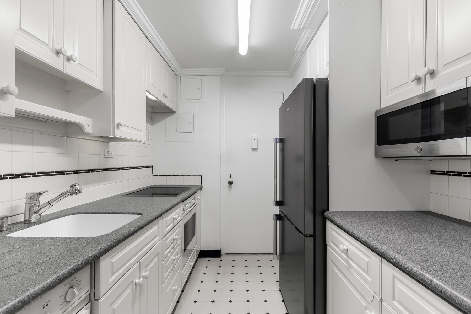 The expansive living and dining area offers the perfect balance of scale and comfort, ideal for both entertaining and everyday living. The galley kitchen features stainless steel appliances, a Miele dishwasher and induction stove, and abundant cabinetry. A powder room off the foyer adds extra functionality, while through-the-wall air conditioning ensures year-round comfort.