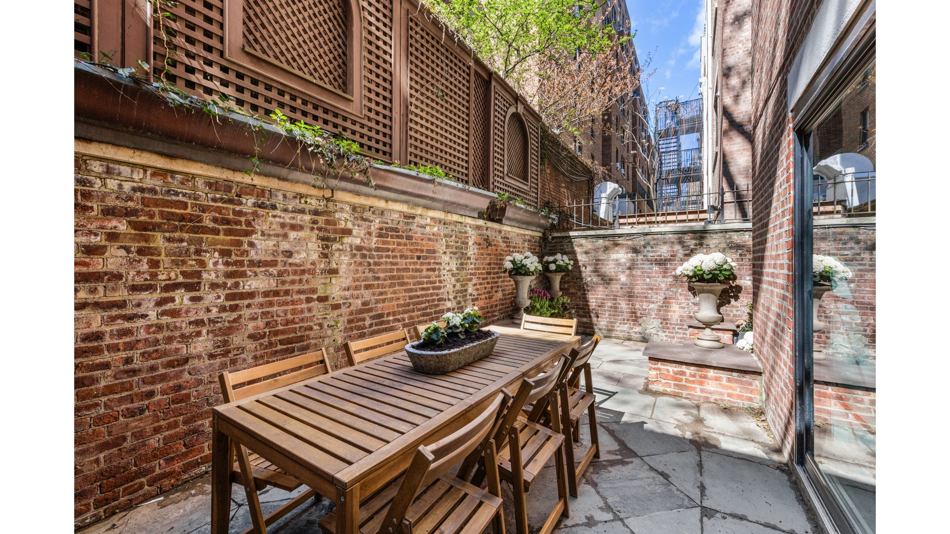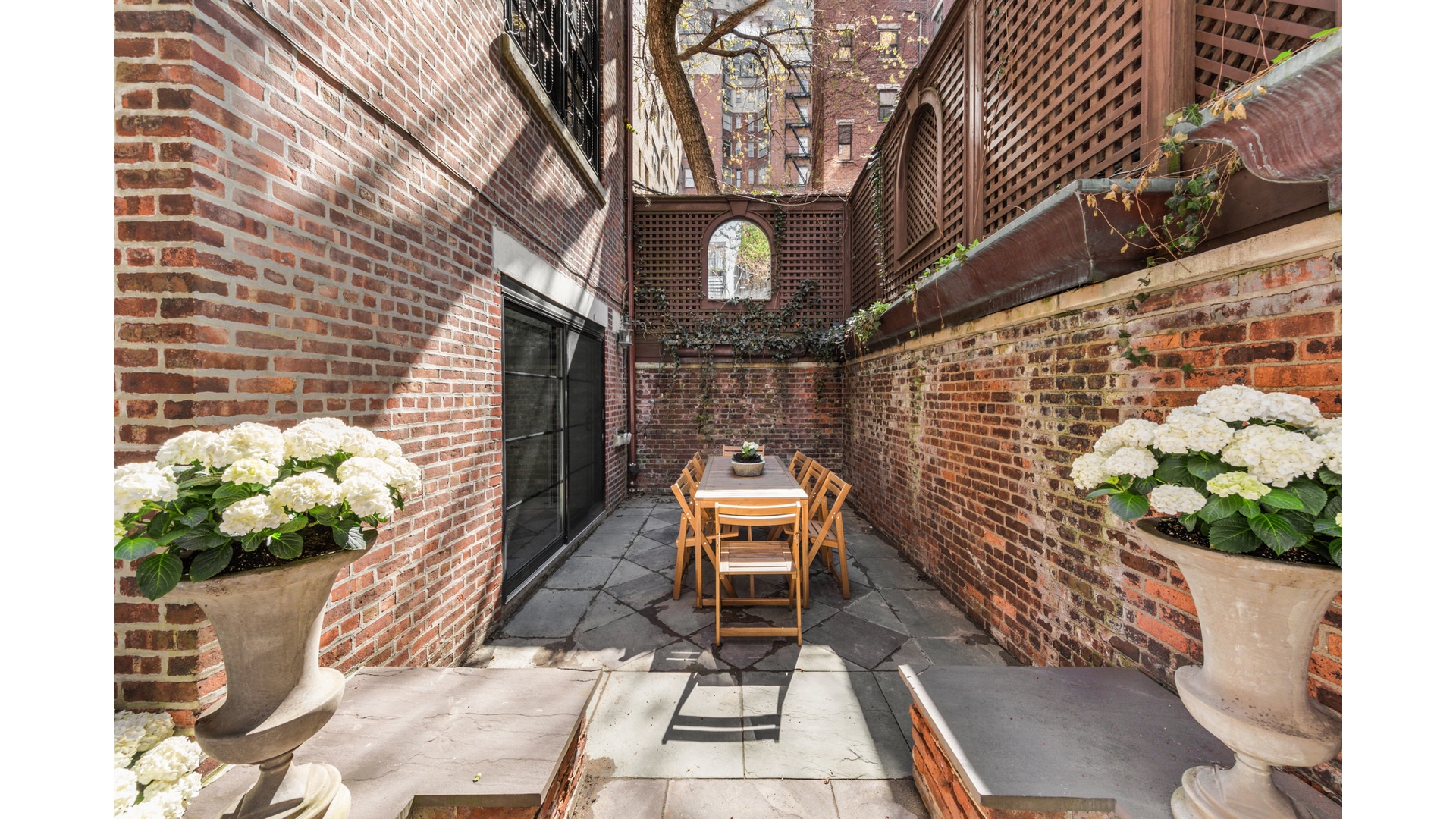 Steeped in history, the magnificent landscaped garden was designed by renowned architect and designer Charles Warren and was featured in Pocket Gardens by James Grayson Trulove. This rare outdoor sanctuary includes cast-iron ornamental City Seals designed by sculptor Rene P. Chamberlain, originally mounted along the old outer walls of the West Side Highway. Tranquil and beautifully composed, it is an extraordinary setting for entertaining or quiet retreat.