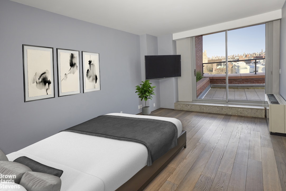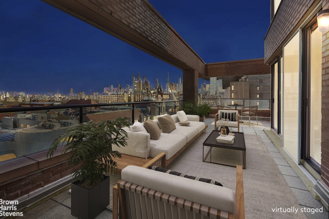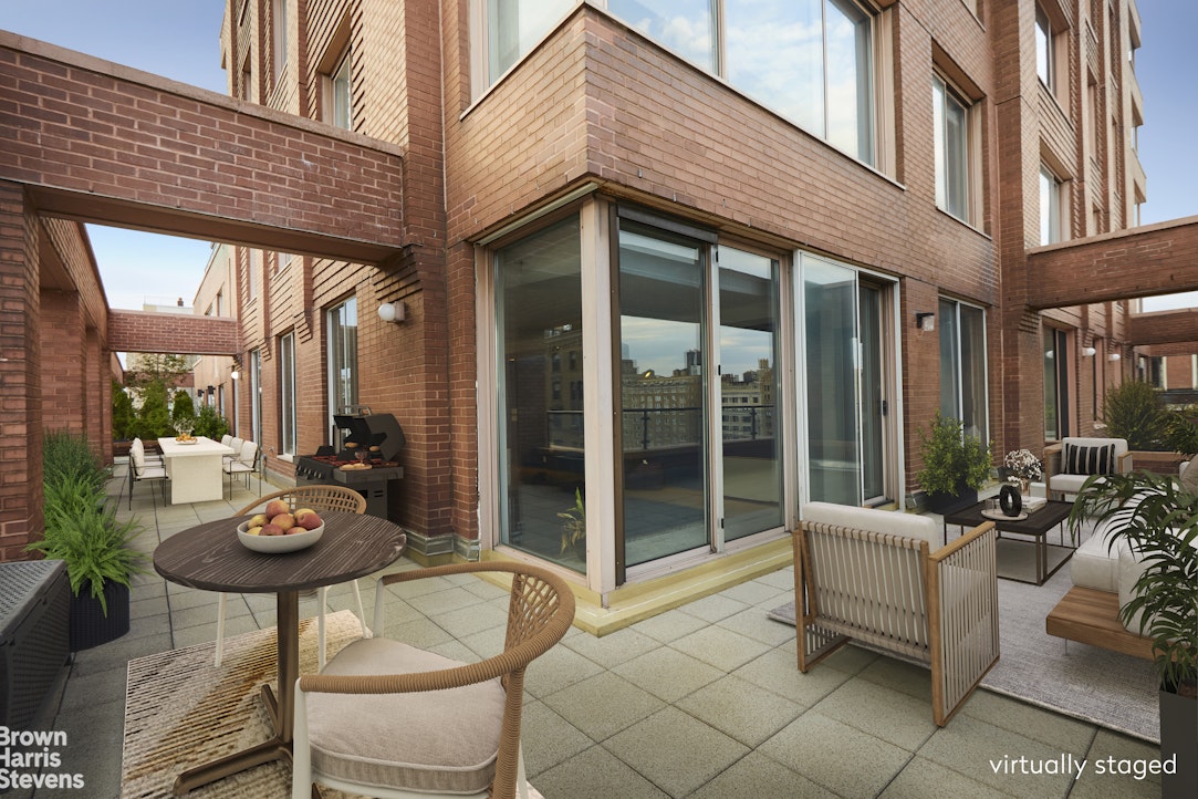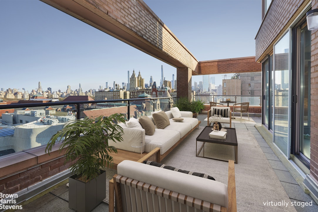 Through a series of glass doors, the interior dissolves into an extraordinary private terrace-nearly 800 square feet of open-air living. Rare in both scale and accessibility, it wraps the residence in light and possibility. Morning light filters softly across its expanse; afternoons linger in quiet sun; evenings unfold against a backdrop of skyline and treetops. Designed with multiple zones for dining, lounging, and entertaining, it is less an outdoor space than a true extension of the home-a garden suspended above the city.