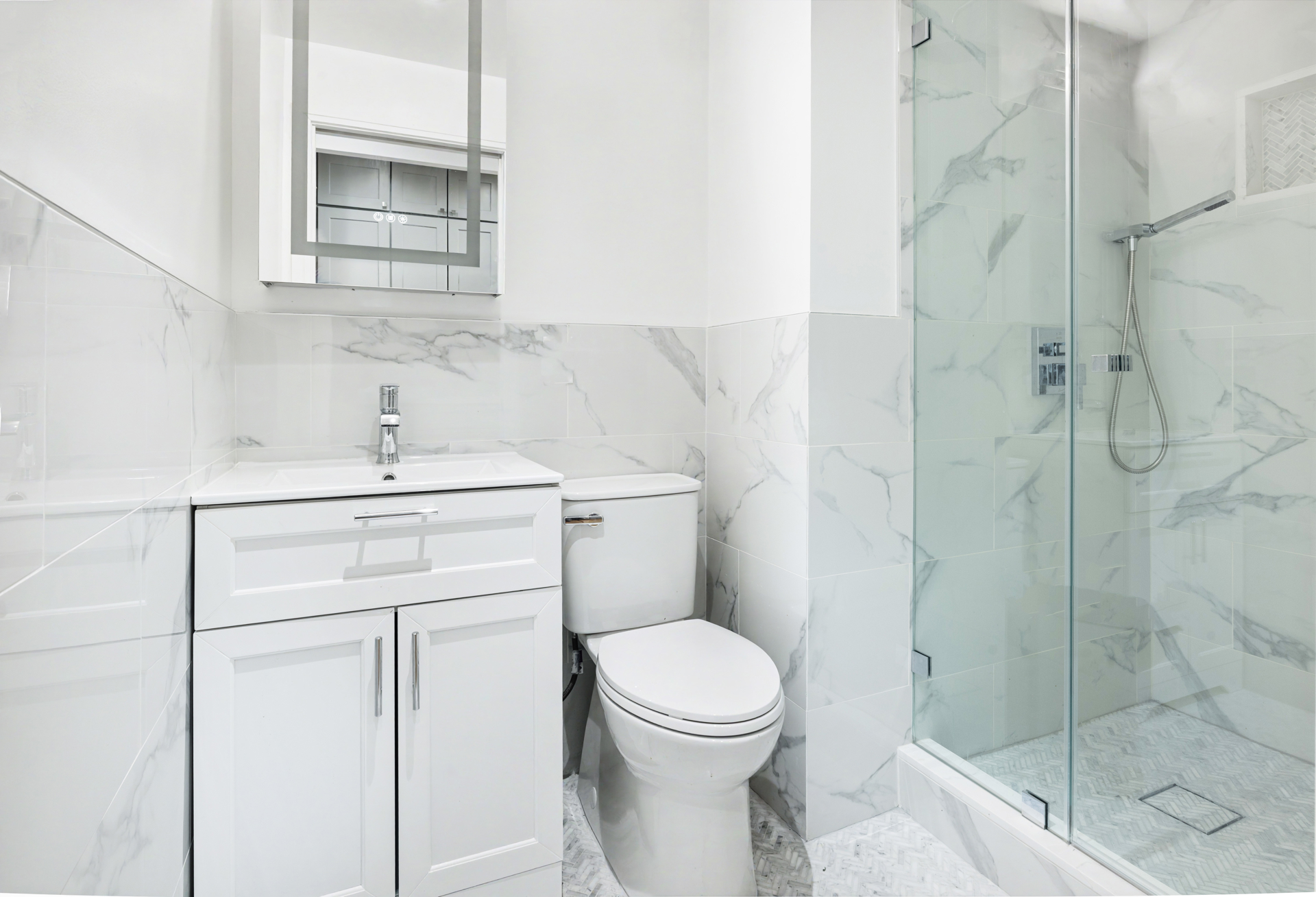 The spa-inspired bath is a dream. Enjoy a glass enclosed stall shower with rain showerhead, porcelain wall tires, herringbone marble floor tiles, state-of-the-art medicine cabinet, and stylish vanity.