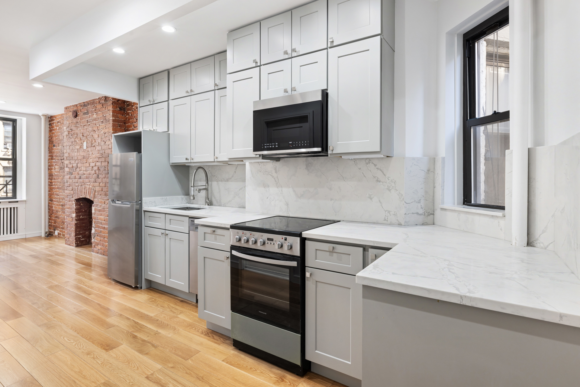 The generous living area features 6' windows that flood the space with natural light and showcase city views. Other highlights include exposed brick, a decorative fireplace and sleek ceiling fan.