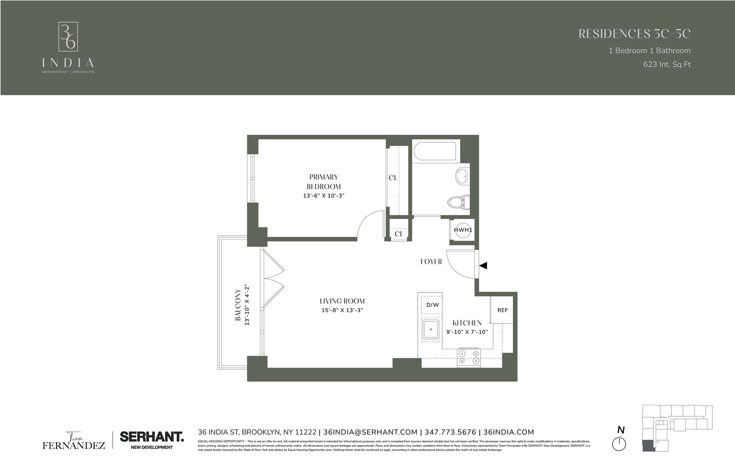 Set within Greenpoint's newest boutique rental building, 36 India Street, Residence 5C is a 623-square-foot one-bedroom, one-bath home that feels every bit like a condominium.