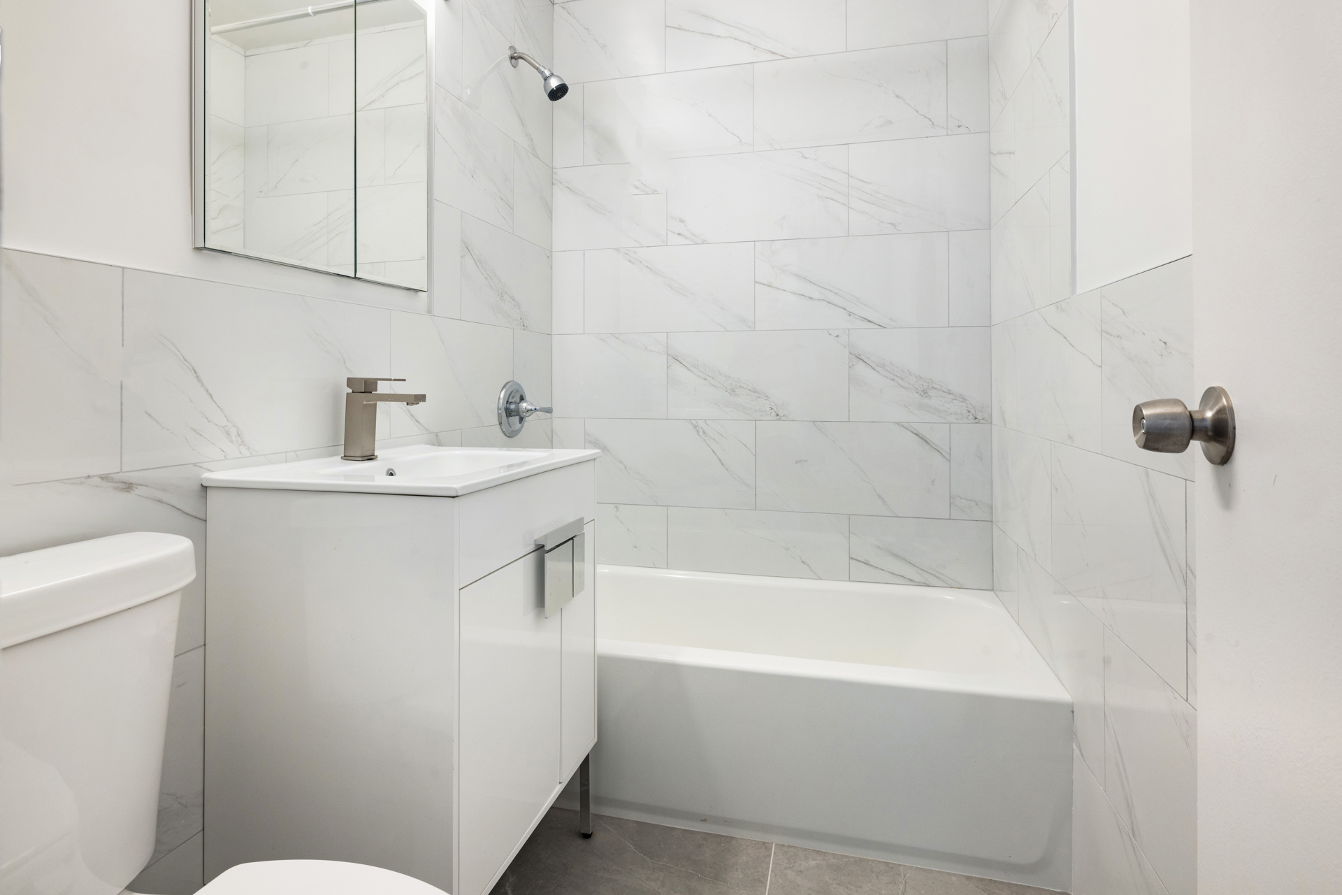 The just Renovated, Spa-like Bathroom is a true retreat, complete with mirrored medicine cabinet, handsome vanity and elegant floor-to-ceiling Wall & Floor Tiles.