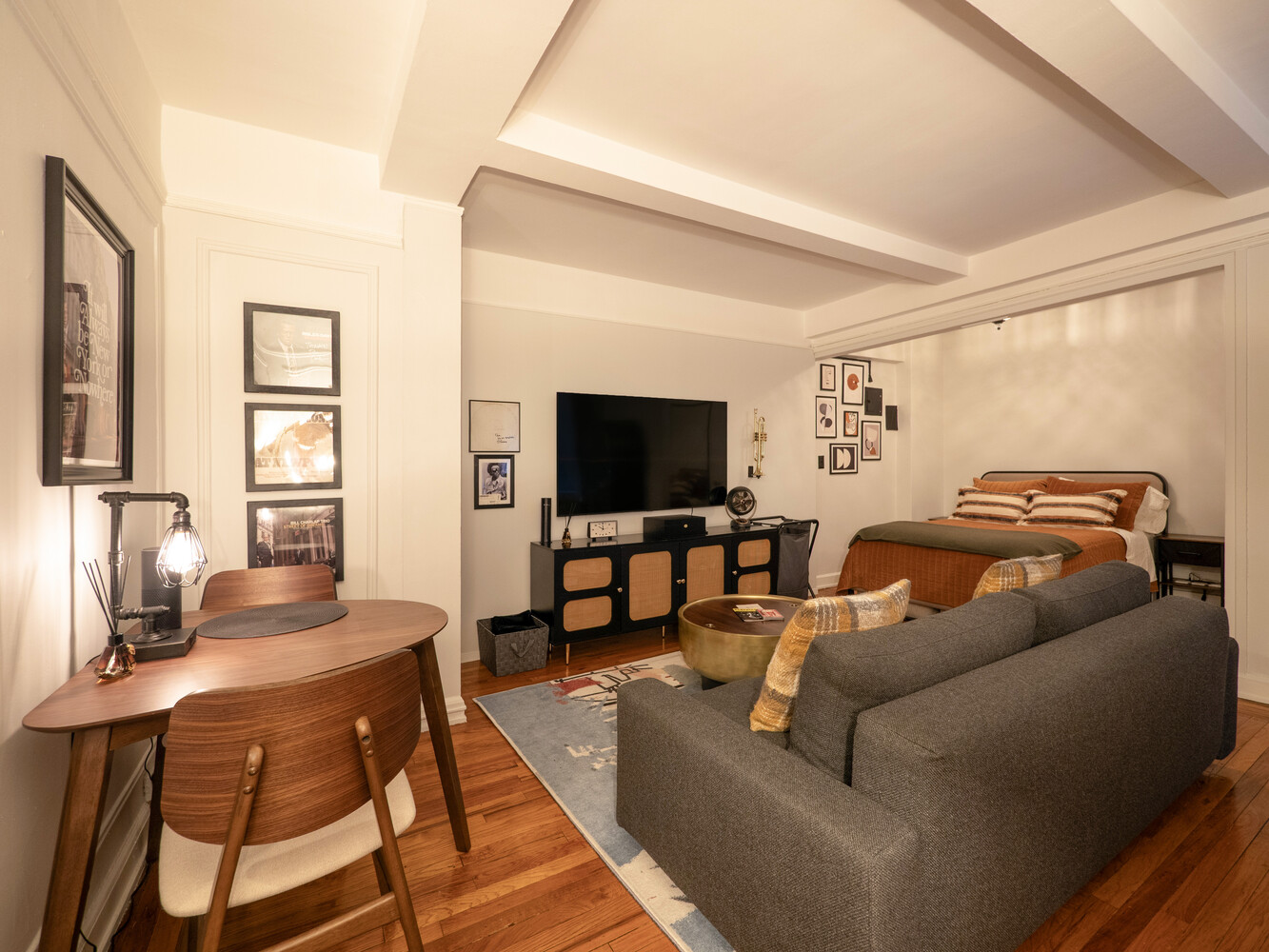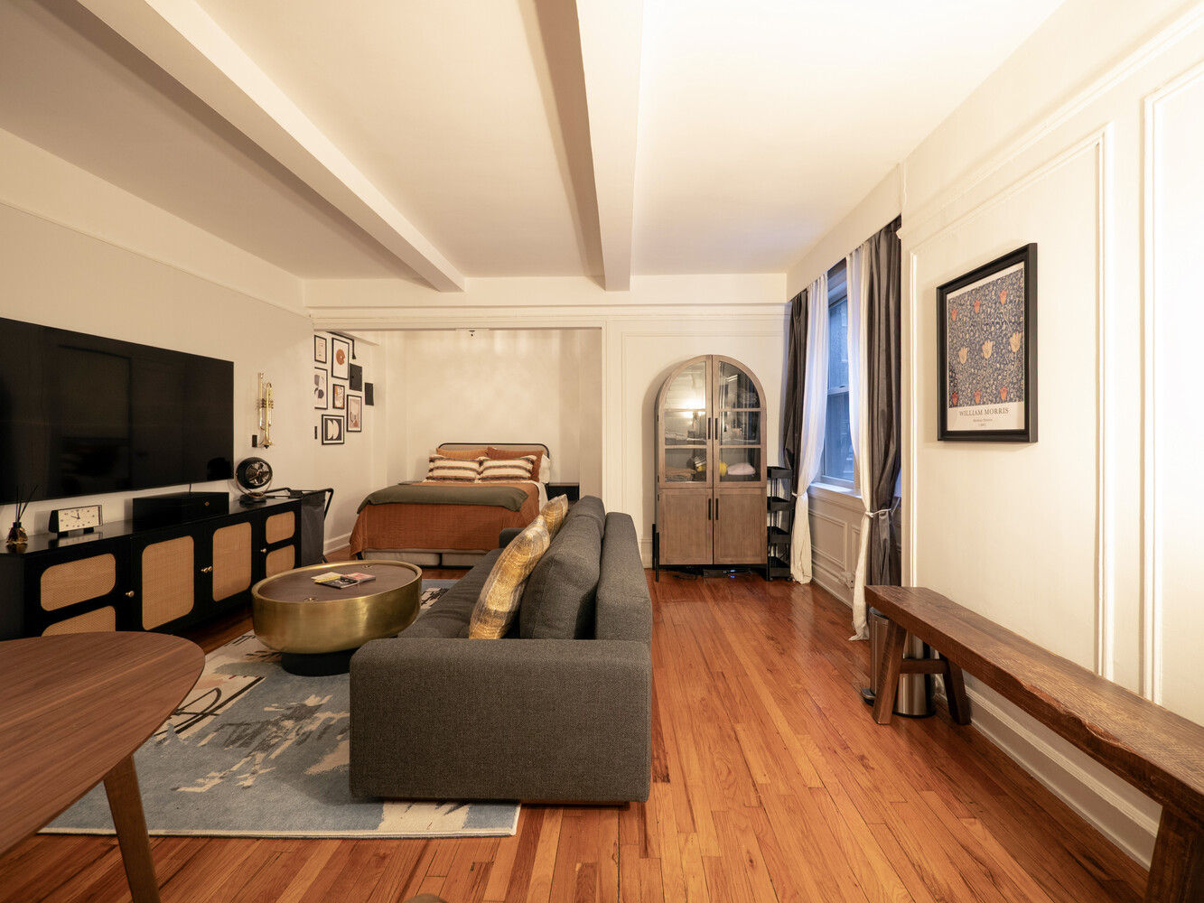 Perched on the 7th floor of a classic pre-war cooperative, this refined residence features a beautifully proportioned layout with distinct areas for living, dining, and sleeping. The separate sleeping alcove easily accommodates a queen-sized bed and nightstands, creating a sense of privacy and separation rarely found in studio living.