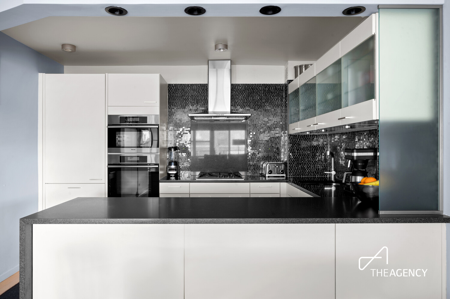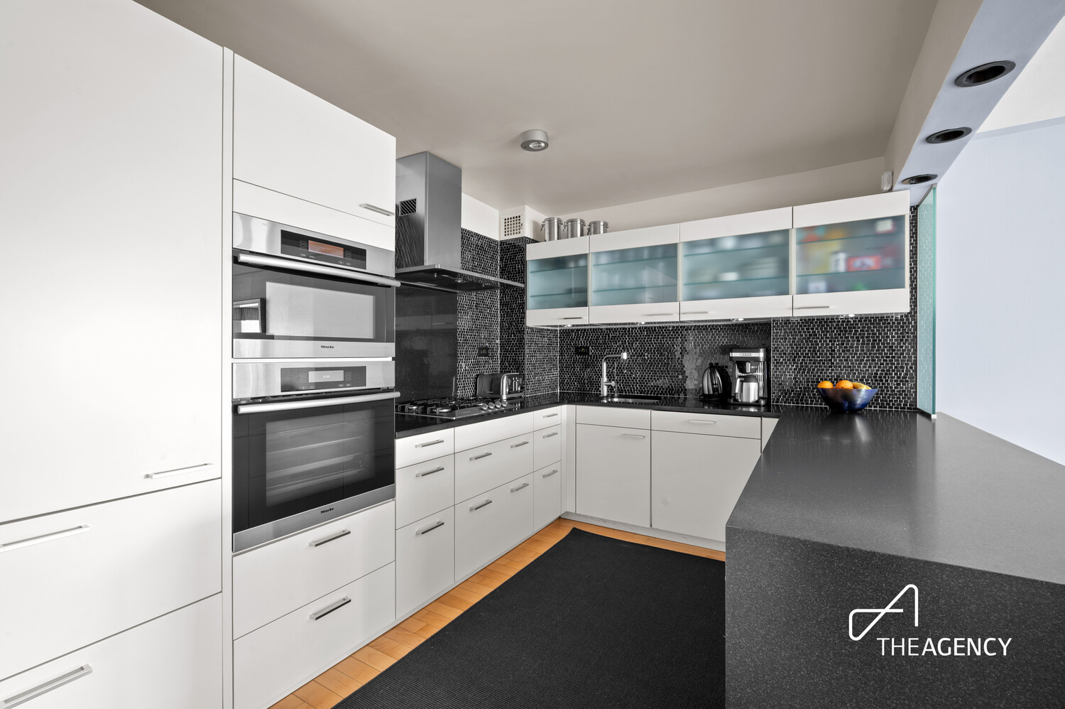 The sunlit, east-facing living and dining area flows seamlessly into a beautifully renovated open kitchen with Poggenpohl cabinetry. High-end appliances include a wall-mounted Miele convection oven and separate microwave, a paneled Sub-Zero refrigerator, and a full-sized paneled Asko dishwasher. Recessed and in-cabinet lighting, Caesarstone countertops, and a striking black granite waterfall breakfast bar complete the space-ideal for both everyday living and entertaining.