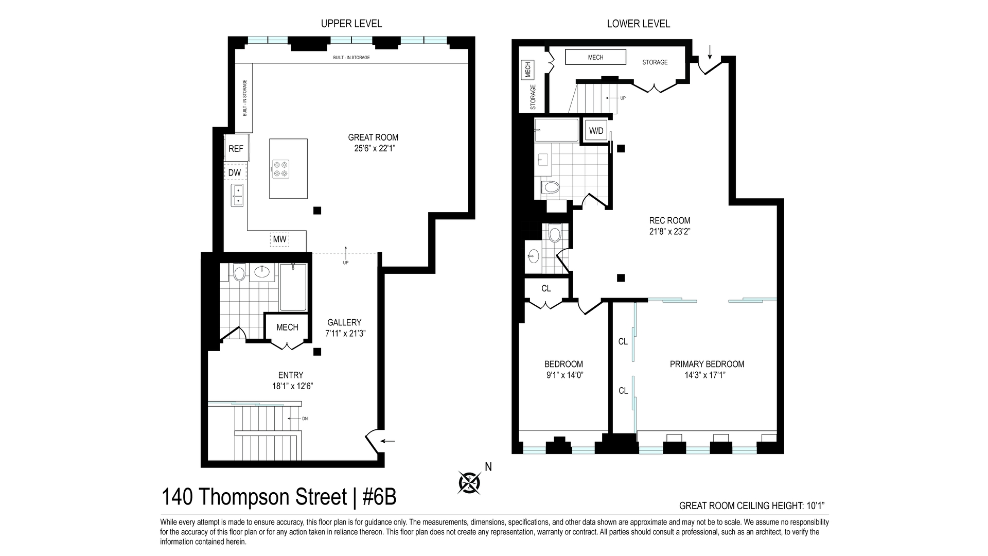 • 140 Thompson Street is a prewar gem built for the Marvin Safe Co. in 1903. It became a cooperative in 1978. This location is at the cross section of Soho and the West Village. Apartment 6B is a large loft-style duplex with just over 2000 square feet. The upstairs features an enormous open living room/dining room facing West with incredible light and unobstructed views. The open concept kitchen has Miele appliances and great storage space. There is a full bathroom upstairs. The apartment has retained some lovely prewar details such as rough hewn wood columns, brickwork walls, 10' ceilings, and an original entry way door frame from a bygone era. Downstairs offers a flexible layout with two nice sized bedrooms, a full bathroom and a half bathroom, a washer dryer, terrific closet space and East exposure.