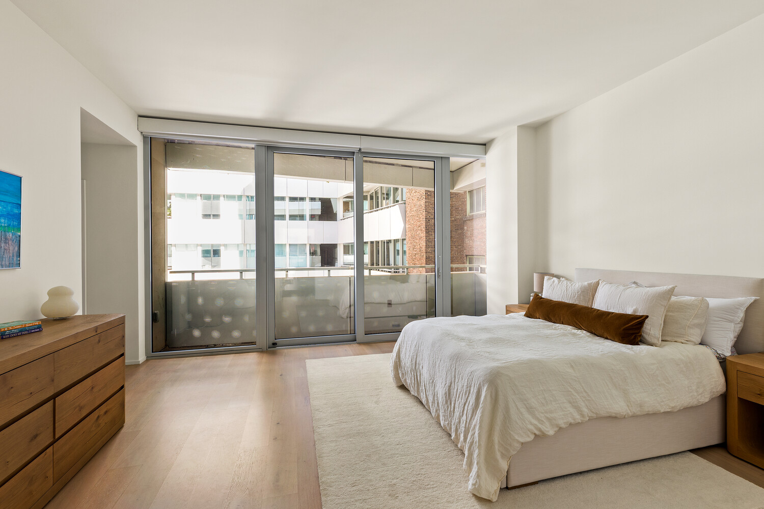 A gracious entry unfolds into a beautifully proportioned living and dining space, defined by soaring 9'6" ceilings and dual northern and southern exposures. Oversized windows frame soft, ambient light throughout, complementing the wide-plank white oak floors and enhancing the home's serene, gallery-like ambiance. The south-facing living room and secondary bedroom overlook the charming, tree-lined streetscape of East 22nd Street, while the serene primary suite is privately positioned to the north, overlooking a landscaped courtyard. Floor-to-ceiling glass doors open to a private 52-square-foot terrace, offering a quiet and intimate outdoor retreat.