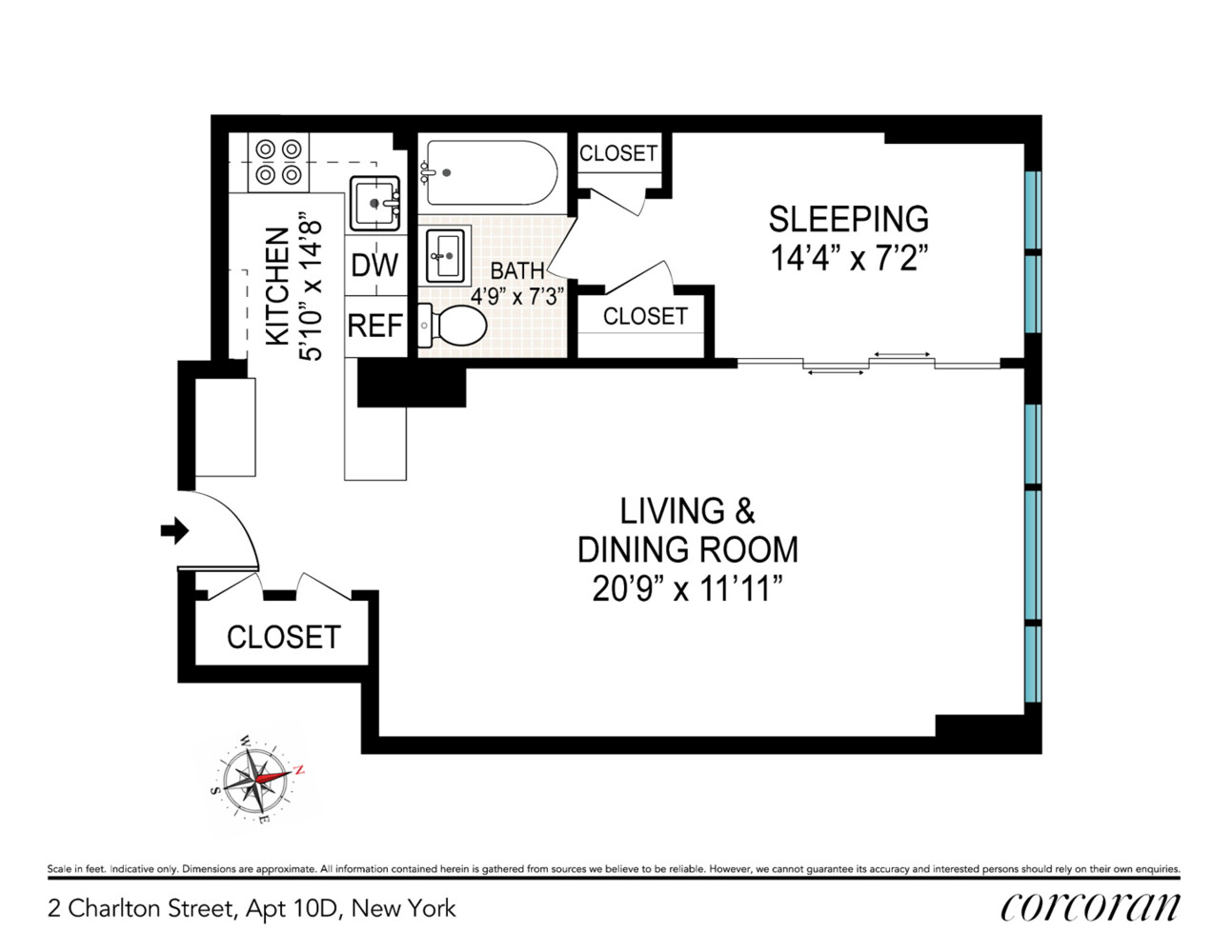 Warm wood floors run throughout, complemented by generous closet space rarely found in junior one-bedroom layouts. The fully equipped kitchen features a Summit refrigerator, Frigidaire dishwasher and range, and a built-in microwave, while the updated bathroom adds modern comfort to the residence.