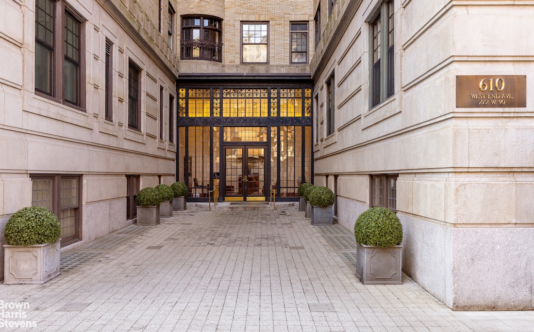 Built in 1911, the Evanston was designed by notable architects, brothers Edward and George Blum, famous for blending Arts and Crafts style with the tile, terra cotta and glazed or tinted brick they encountered in Paris while studying architecture at the Ecole des Beaux-Arts. The areaway ironwork at 610 West End Avenue is an amalgam of bass clef signs and prairie-style stained glass. This boutique co-op is a full-service building in a tranquil location that offers a full-time doorman, live-in resident manager, and a dedicated staff. Amenities include private storage, bicycle storage, central laundry room, and a landscaped common roof terrace. Pets welcome.