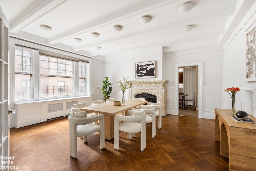 Spanning over 2,700 sq ft, this serene prewar residence boasts four exposures and oversized, triple-wide windows that illuminate the space in exceptional natural light. Offered for the first time in over 50 years, this rarely available home features picturesque views of the area's historic architecture and the lush, tree-lined street below. The interior radiates timeless character, showcased through soaring 10-ft beamed ceilings, original herringbone floors, intricate moldings, wainscoting, and 2 distinguished decorative fireplaces with ornate mantels.