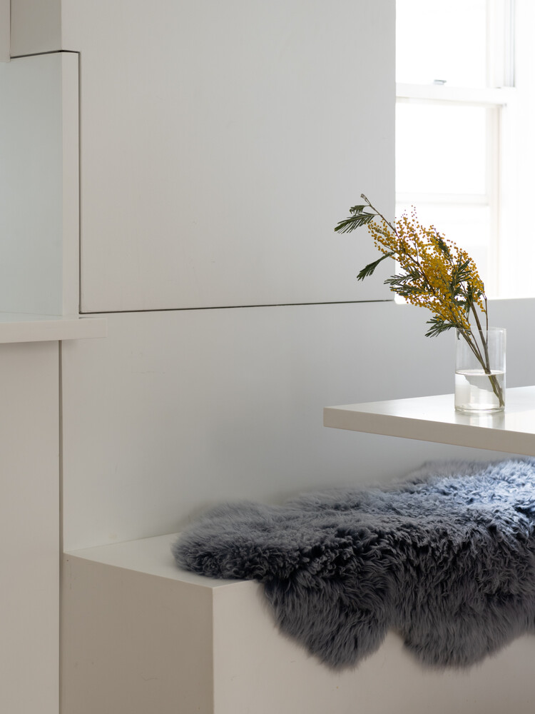 The kitchen includes custom cabinetry, Corian countertops, a striking seamless sink carved from a single block of Corian, and top of the line appliances, including a Bosch range, GE refrigerator, and Bosch full size dishwasher. A custom banquette with Corian top hides additional storage.