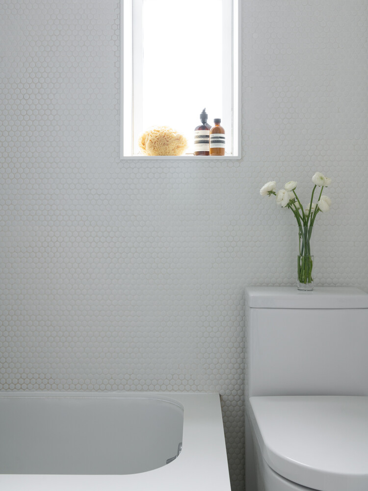 The chic bathroom features heated floors, Corian countertops, and even a Bosch washer/dryer!