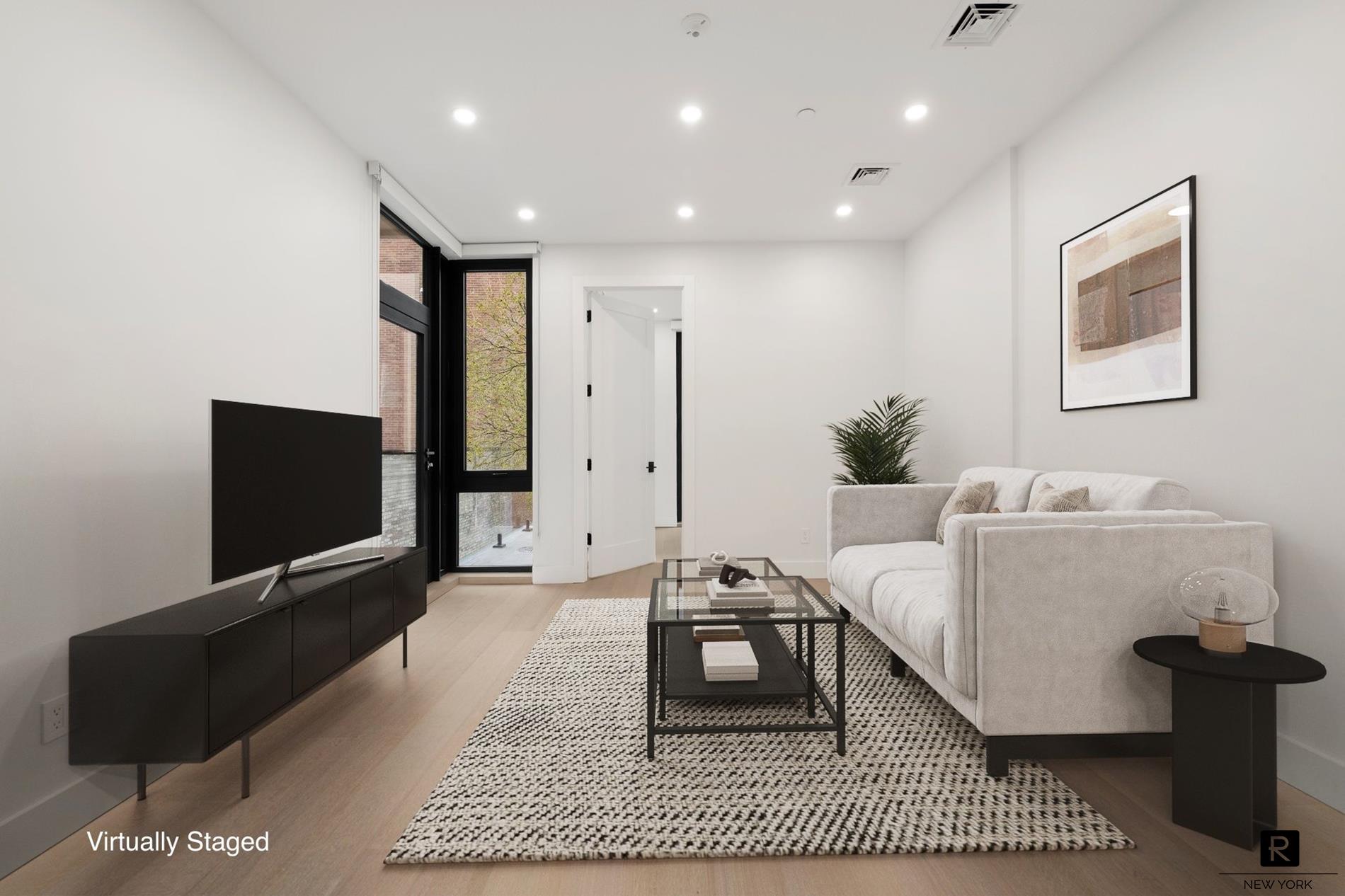Experience the best of Williamsburg living in Residence 2B at Layla, a sophisticated new boutique condominium defined by clean lines and an abundance of private outdoor space. This thoughtfully designed 2-bedroom, 1-bathroom home features a bright, open-concept layout anchored by 7-inch engineered white oak floors and floor-to-ceiling windows. The seamless indoor-outdoor flow is highlighted by a spacious living area that opens directly onto the first of two private terraces.