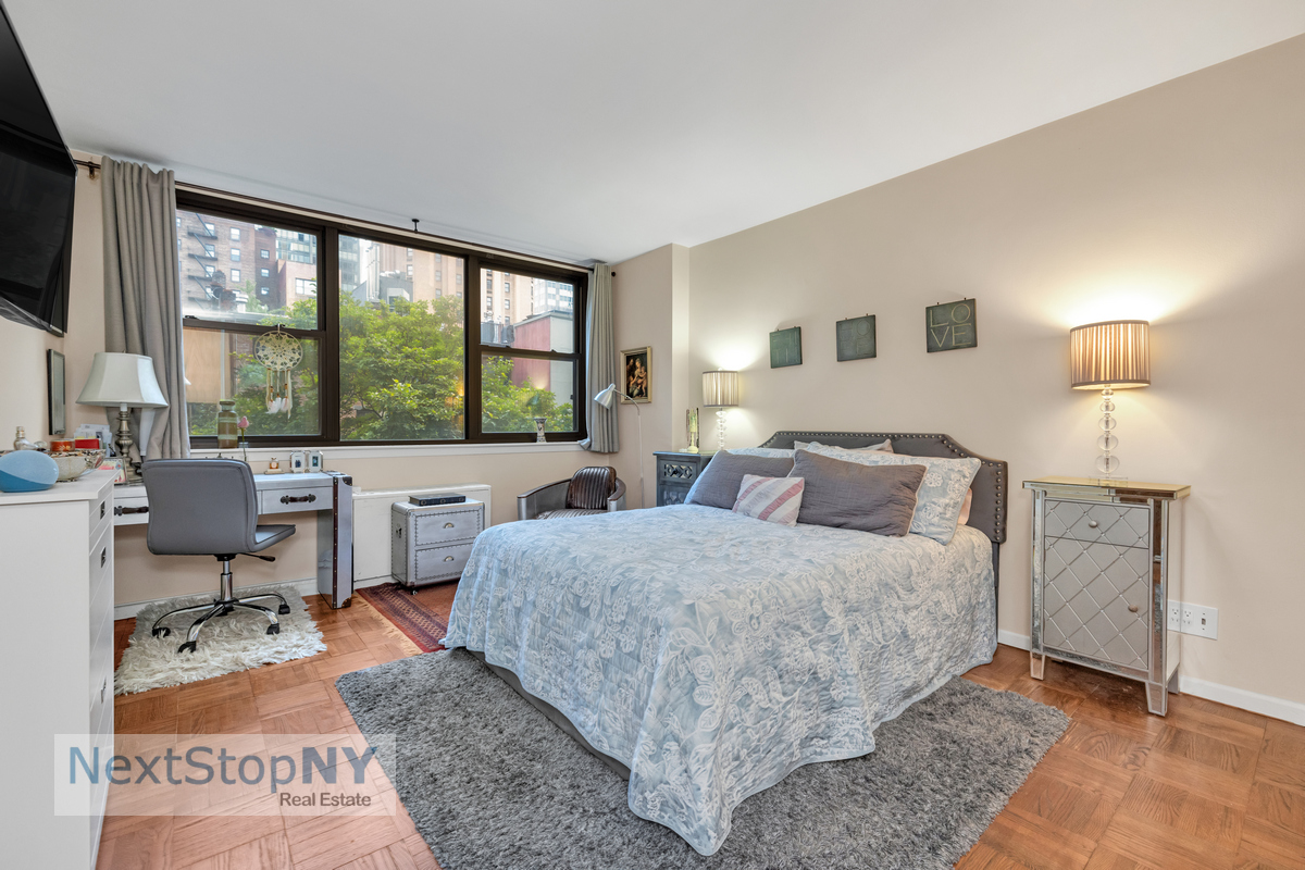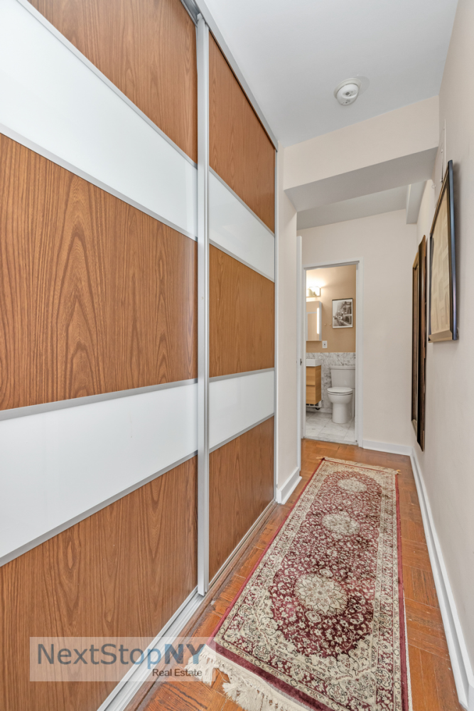 The king-sized primary suite is a true retreat, featuring generous proportions, multiple closets, and a luxurious Calacatta marble en-suite bath. The second bedroom is equally versatile-ideal as a guest room, home office, or both-with a beautifully renovated marble bath just outside. In total, the residence offers five closets, including two oversized walk-ins.