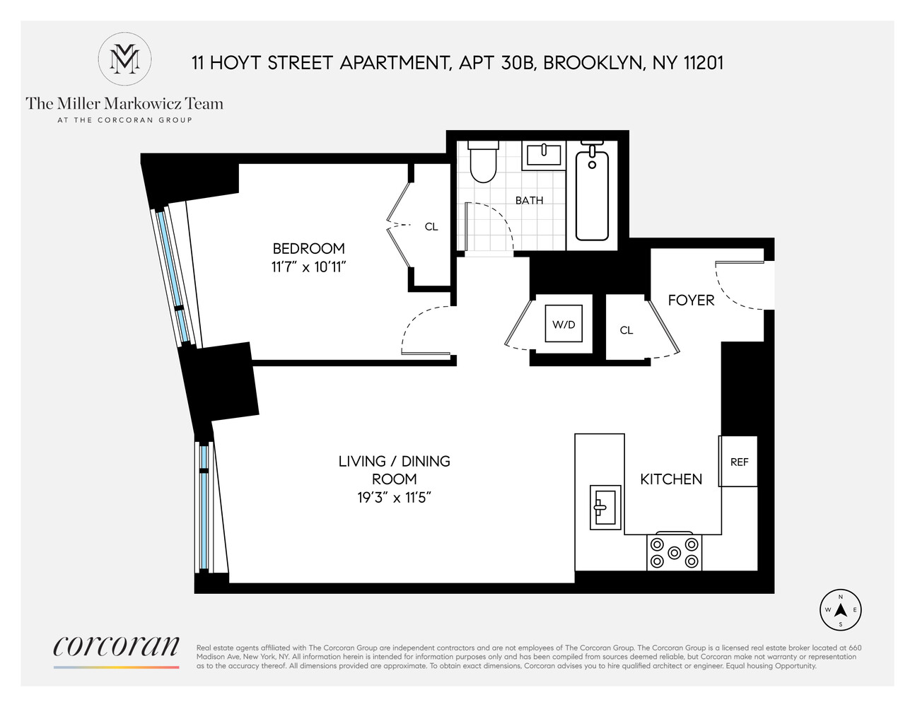 Residence 30B at 11 Hoyt is among the building's most sought-after one-bedroom layouts, offering an expansive floor plan and sweeping western views of the Manhattan skyline, the Statue of Liberty, and New York Harbor.