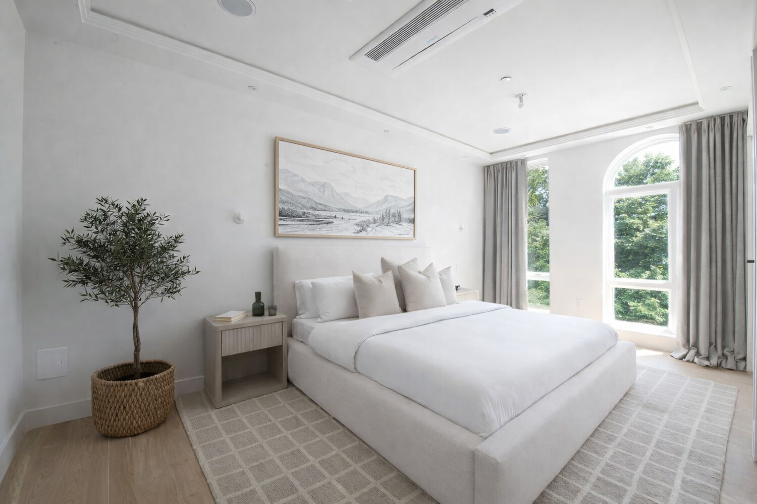 The lower level hosts the sleeping quarters, with three well-proportioned bedrooms, each with southeastern exposure and excellent natural light. The two secondary bedrooms easily accommodate queen-size furniture and full bedroom sets, supported by generous closet space and a full bathroom conveniently positioned nearby.