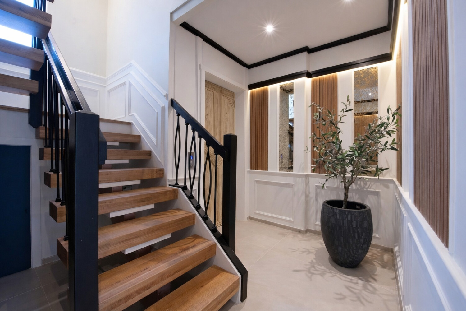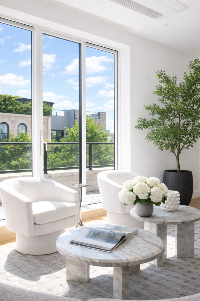 A one-of-one, the penthouse is a spacious three-bedroom, two-bath, and one-half-bathroom duplex offering 2,219 square feet of interiors and an exceptional 789 square feet of outdoor space across the top two levels. The layout composition provides a clear separation between living and private areas, creating a comfortable and well-balanced home.