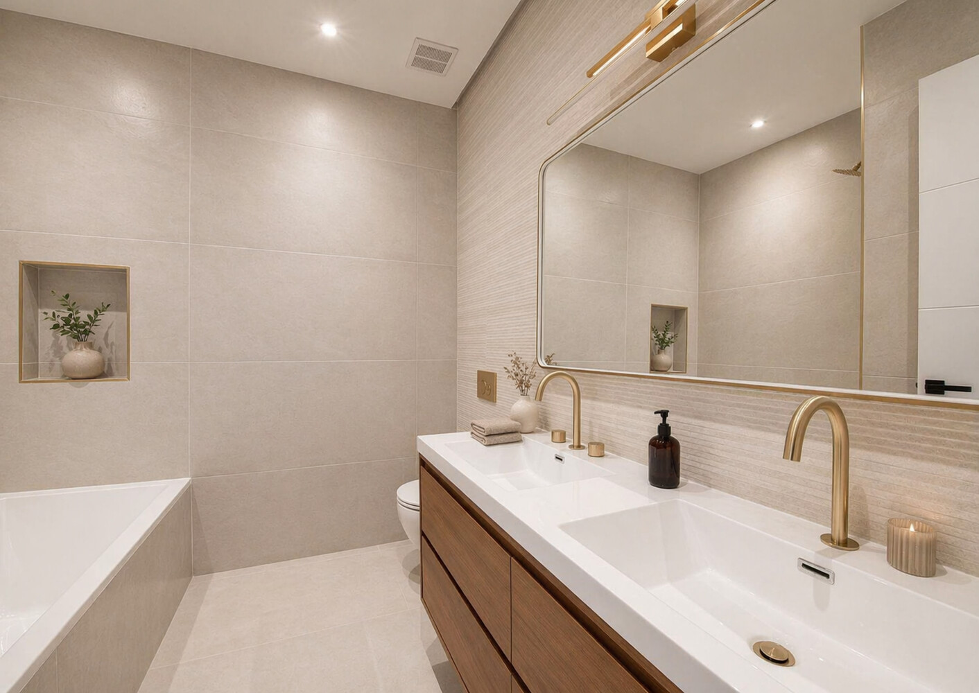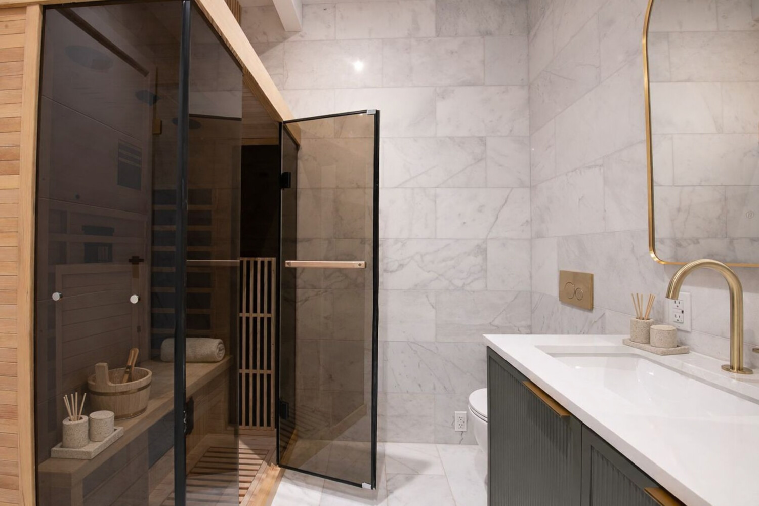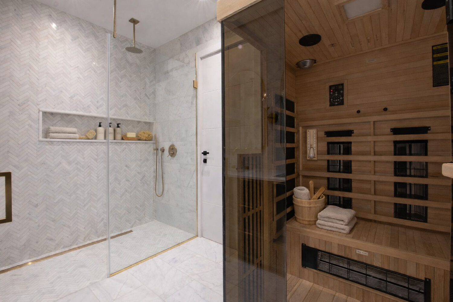 The primary suite is truly impressive, offering king-size accommodations, abundant storage, and an en-suite bathroom complete with a dual vanity, oversized rainfall shower, and infrared sauna.