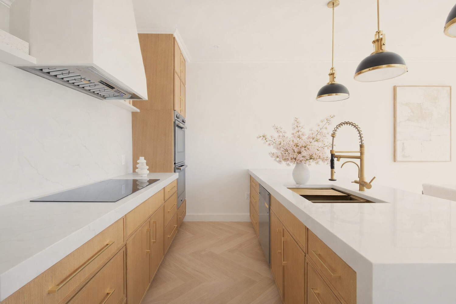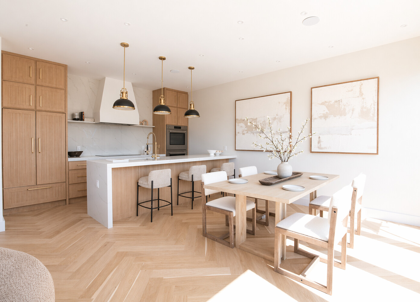 On the main level, a sun-filled open living and dining area extends to a southeast-facing terrace that spans the length of the home, creating a bright and inviting setting for everyday living and entertaining. The chef's kitchen is thoughtfully designed with clean finishes and a high-end appliance package, including a Bertazzoni induction range, double oven, French-door refrigerator, and quartz slab waterfall countertops. White oak herringbone flooring throughout the residence adds warmth and continuity.