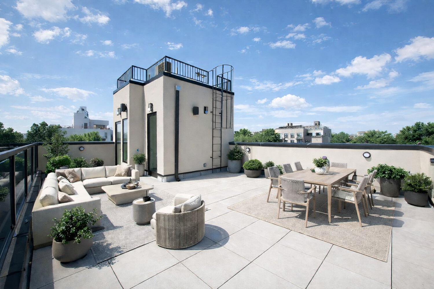 A 582 square foot private roof deck sits atop the building, boasting sweeping 360 degree views and a generous outdoor setting for dining, entertaining, or quiet relaxation.