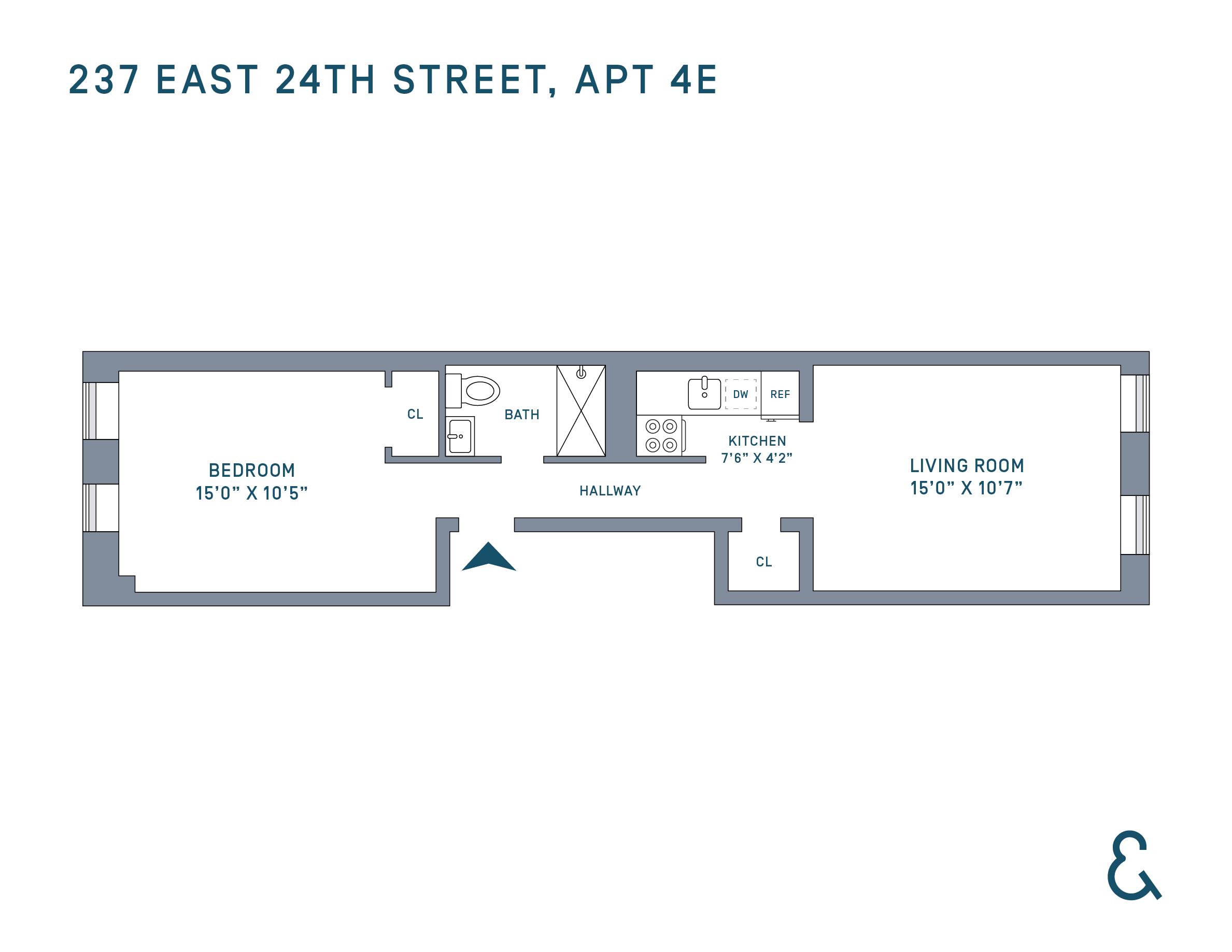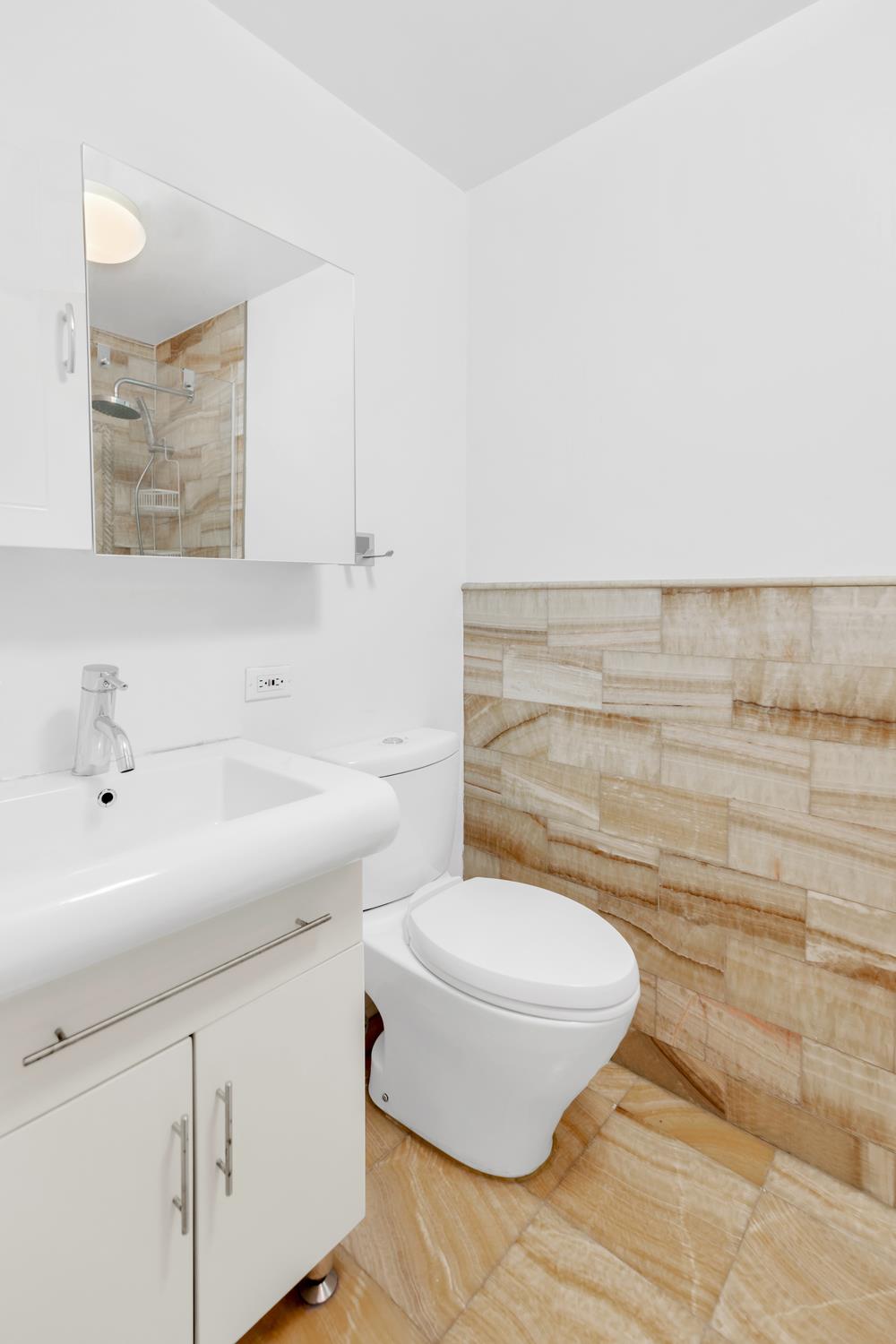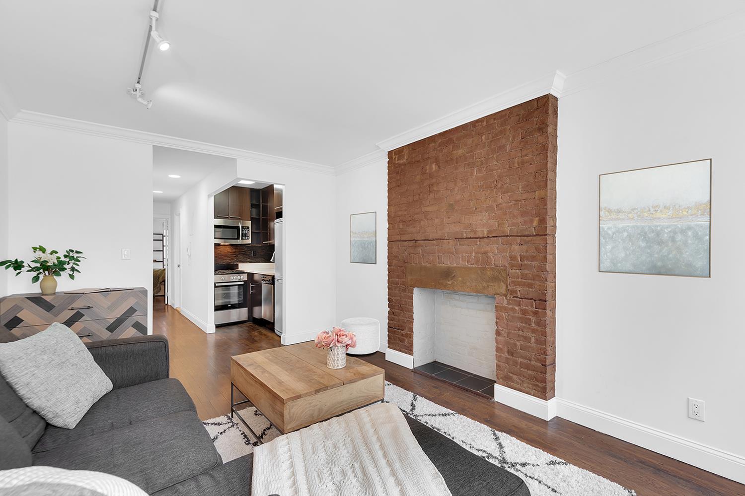 Bright and south-facing, this prewar walk-up gets great natural light and has hardwood floors and tall ceilings that make the space feel open and airy. A decorative fireplace and exposed brick give the space a touch of charm, and the kitchen has been updated with modern finishes and stainless steel appliances, including a dishwasher. The bedroom sits at the back of the apartment overlooking a courtyard and neighboring carriage house, keeping it quiet and removed from street noise.
