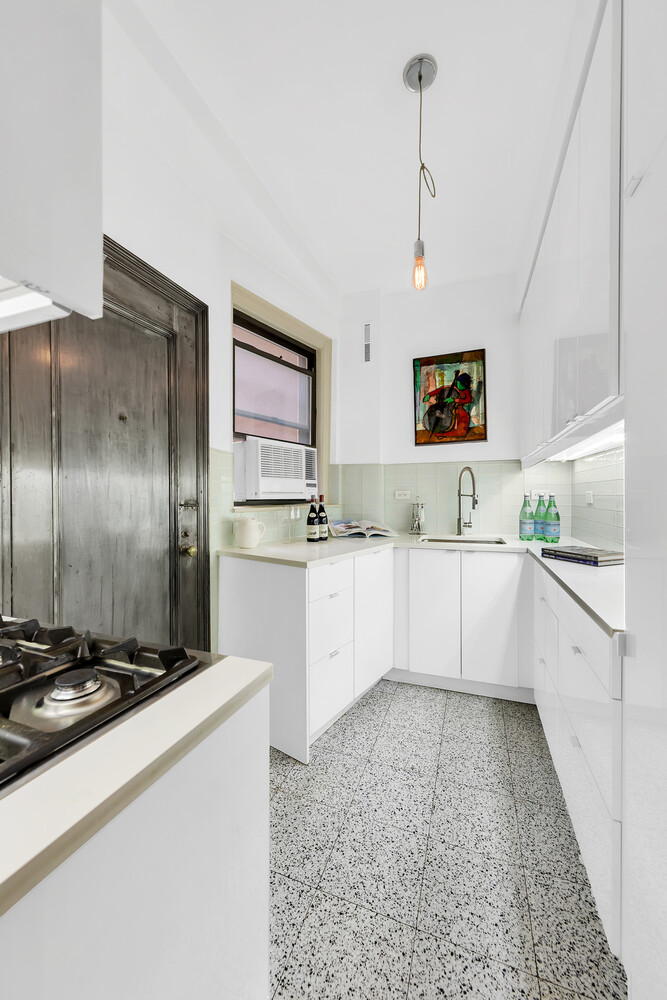 The beautifully renovated windowed kitchen, clad with glass tile backsplash and terrazzo floor, includes high-end appliances to include a Liebherr refrigerator, Bosch dishwasher and Verona gas stove.