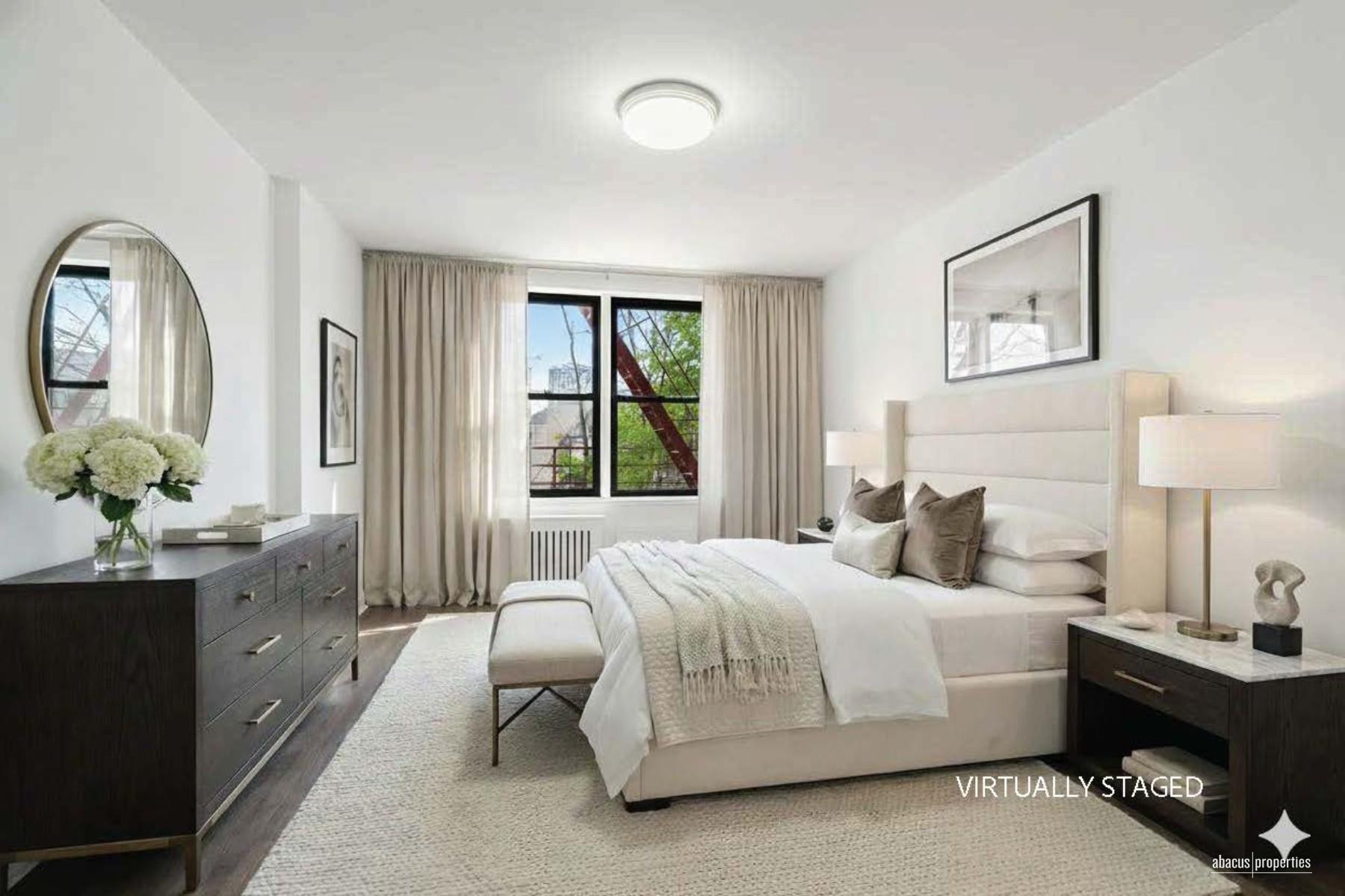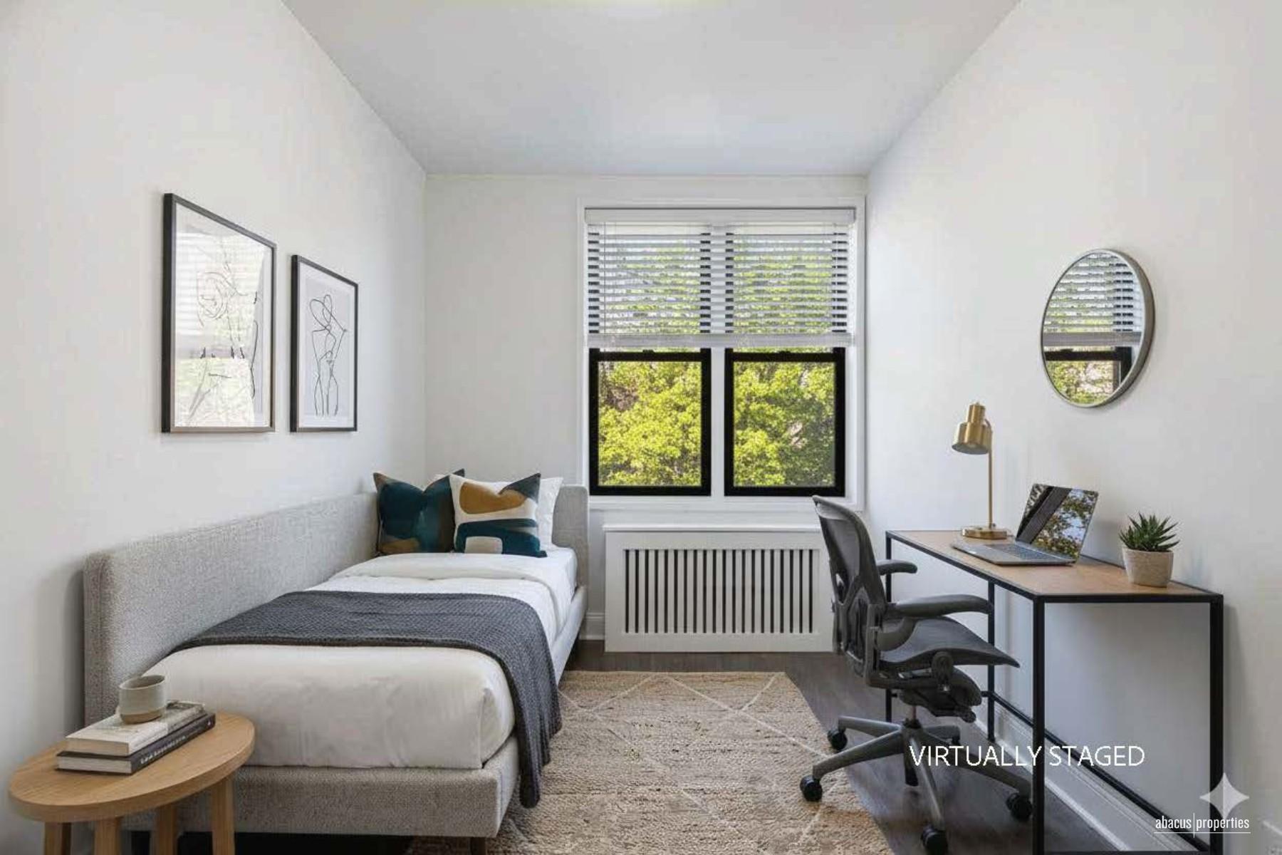 Bathed in natural light from eastern and western exposures, the home offers peaceful treetop views, rich hardwood floors, and exceptional storage throughout. A brand-new bathroom finished in classic subway tile completes this move-in-ready sanctuary.