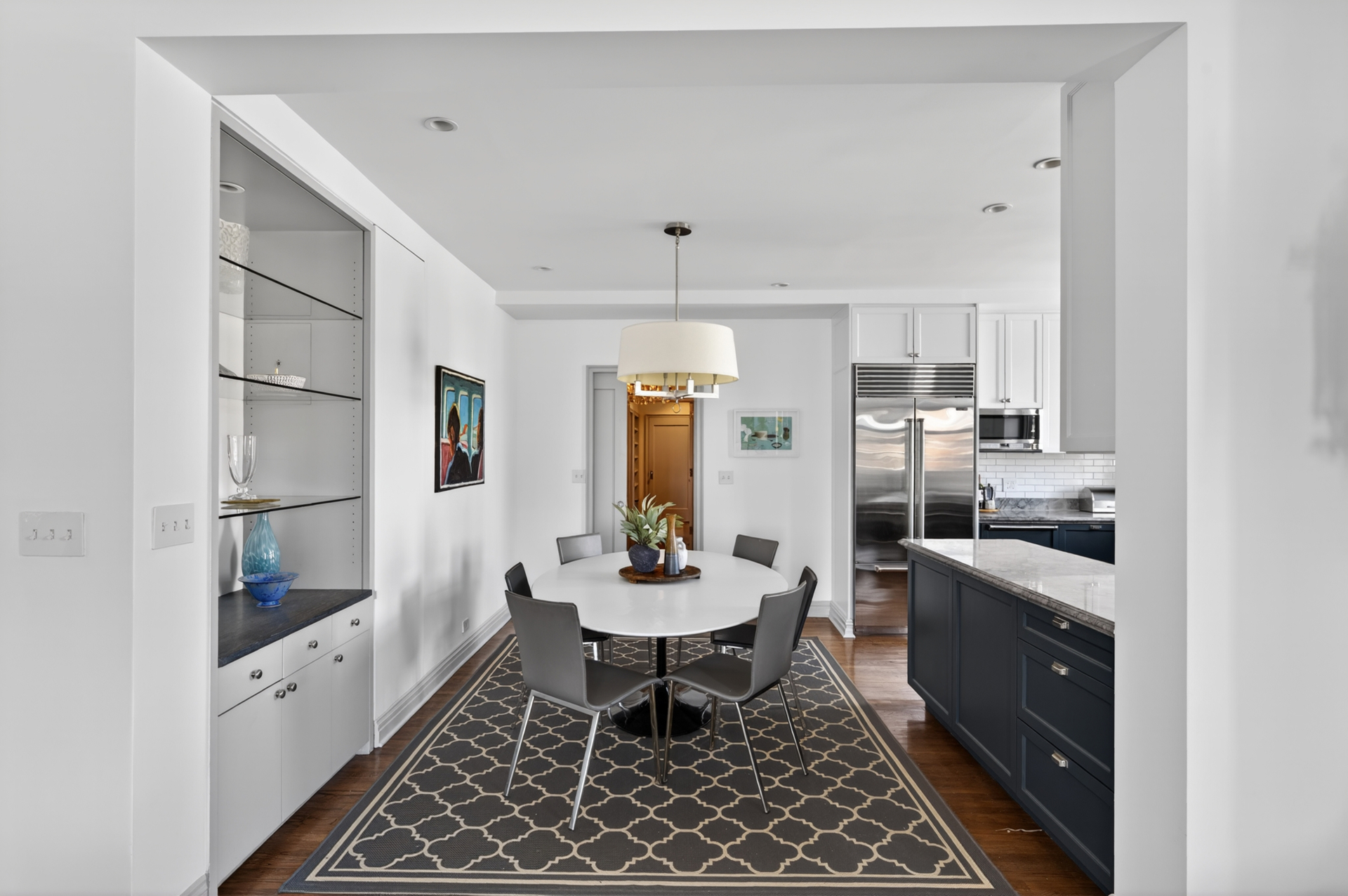 At its heart is a true eat in kitchen, designed with the sensibility of a suburban retreat yet executed with the precision of a chef's workspace. Custom cabinetry, stone counters, a Wolf range and a Sub Zero refrigerator come together in a space that is as functional as it is beautiful. It is a room meant for mornings that begin slowly and dinners that linger long after the plates are cleared.