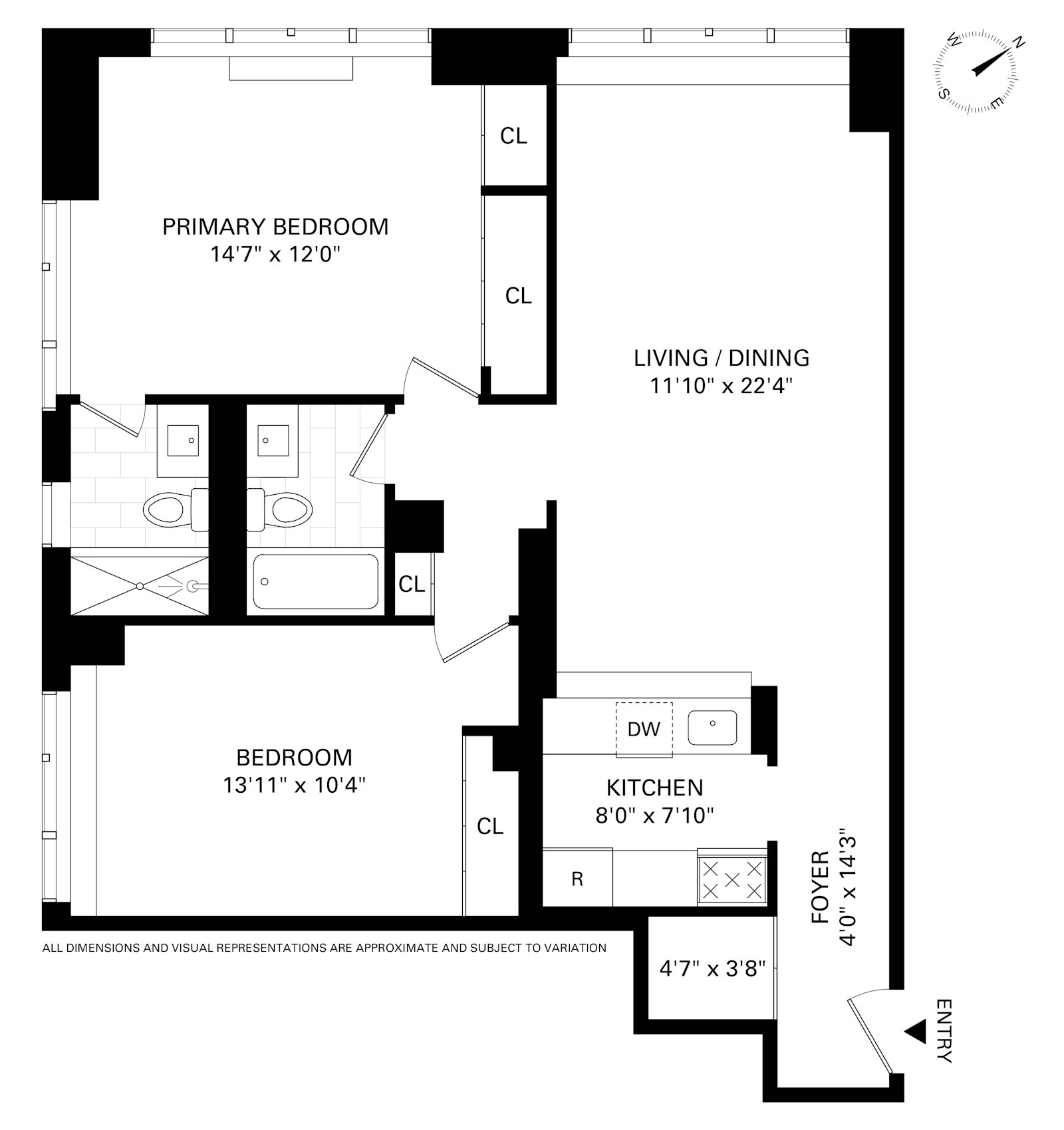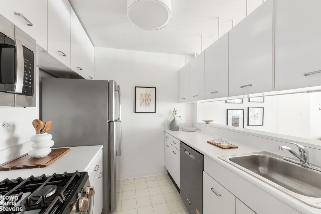 An entryway foyer leads into a kitchen with updated stainless-steel appliances and abundant storage. The partially open concept with an island provides the the perfect setting for casual dining and allows for a seamless flow into the living area. The two generously sized bedrooms each enjoy charming views of a classic pre-war building that evoke the elegance of Paris, lending a rare and romantic European feel to the home. The primary suite features an ensuite windowed bathroom that has been tastefully renovated. The second full bathroom is well-appointed and has been thoughtfully renovated as well.